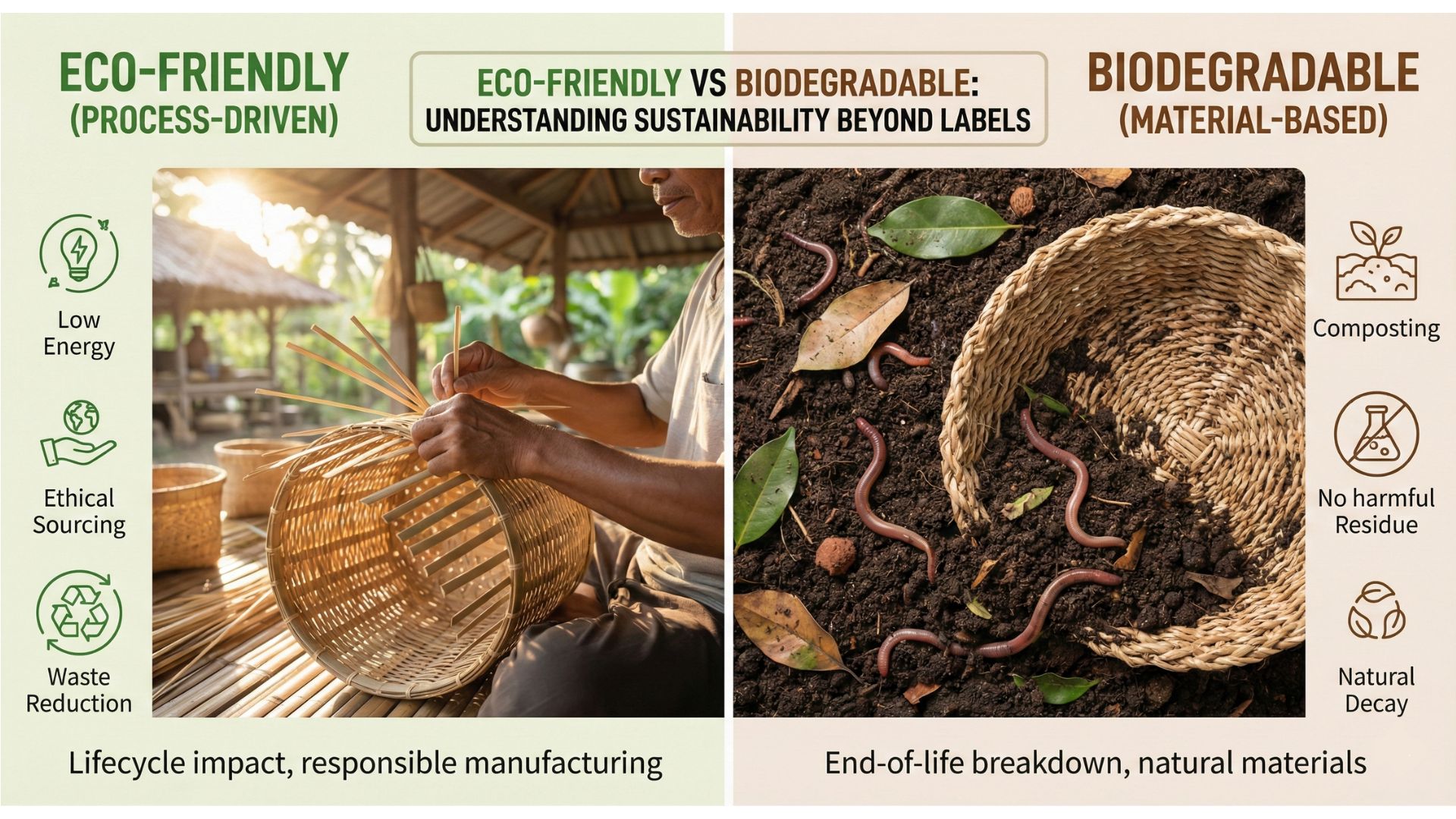 In global trade, sustainability terminology is increasingly central to sourcing decisions, regulatory compliance, and brand credibility. However, within industries such as handicraft and home décor, these terms are often misunderstood, misused, or applied interchangeably. Two of the most frequently confused concepts are eco-friendly and biodegradable. While both relate to environmental responsibility, they address very different […]